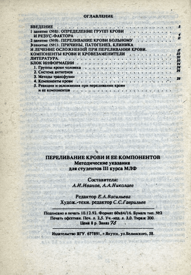 Переливание крови и ее компонентов : метод. указания для студентов III курса МЛФ / Гос. ком. Рос. Федерации по высш. образованию, Якут. гос. ун-т им. М. К. Аммосова ; [сост.: А. И. Иванов, А. А. Николаева]. - Якутск : Изд-во ЯГУ, 1993. - 36 с.