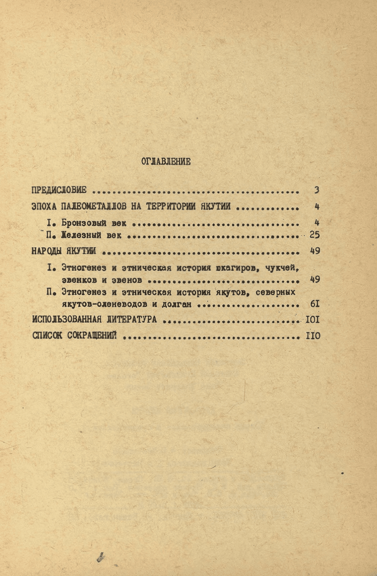 Данное пособие является продолжением изданного 1990 г. учебного пособия "Археология Якутии (каменный век)". В настоящее издание включены разделы, посвященные проблемам эпохи бронзы и раннего железного века, этногенеза и ранней этнической истории долган, чукчей, эвенов, эвенков, юкагиров, якутов