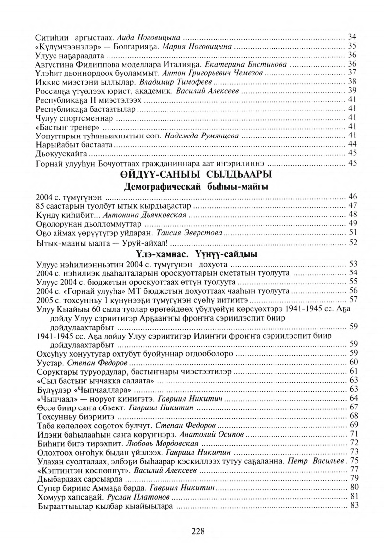 В первой части этой книги рассказывается об исключительных достижениях, высоких показателях, достигнутых в самых различных проявлениях жизни и деятельности трудящихся и молодежи Горного улуса 2004 г. Далее вносятся итоги развития улуса в 2004 г.