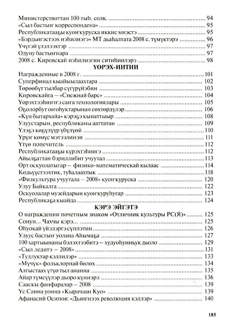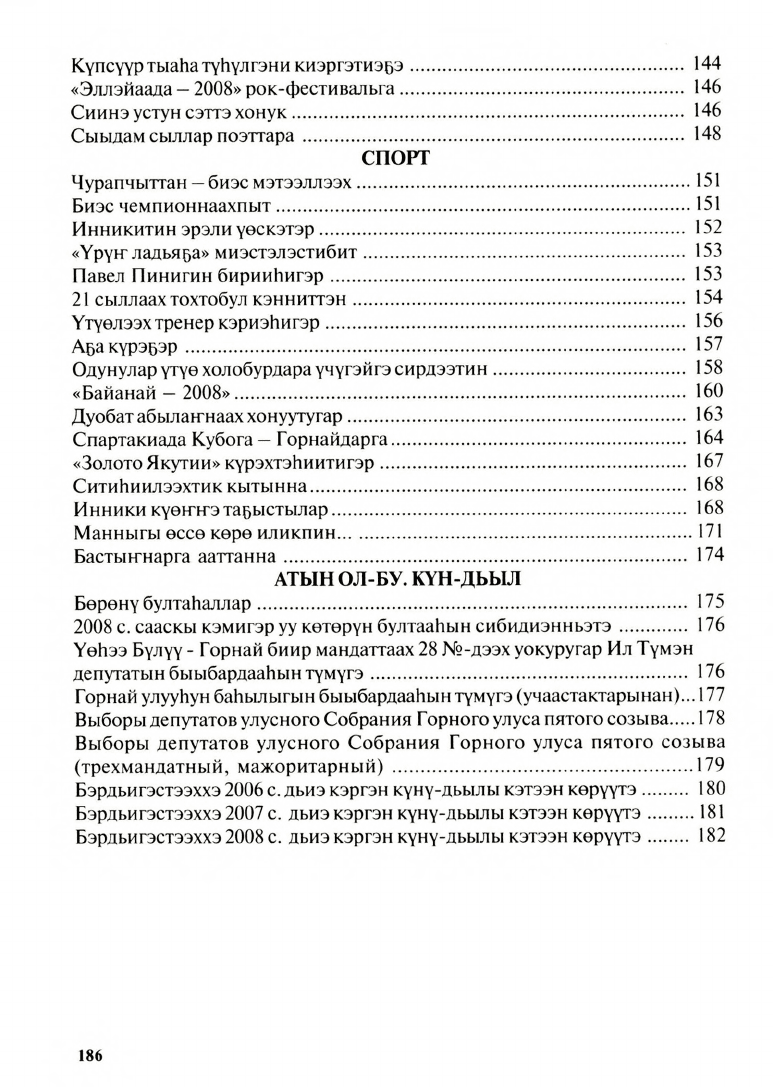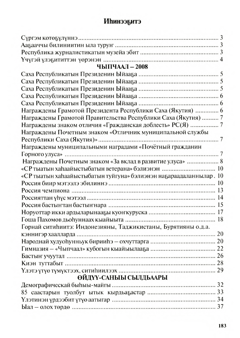 Чыпчаал - 2008 : өйдүү-саныы сылдьаары / "Үлэ күүһэ" хаһыат ред. ; [кинигэ В. И. Алексеев идеятынан, бэчээккэ бэлэмнээһининэн, ред. таҕыста ; хомуйан оҥордулар: В. И. Алексеев, Е. А. Пономарева]. - Дьокуускай : Медиа-холдинг "Якутия", 2009. - 186, [1] с.