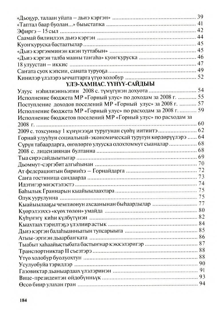 В первой части этой книги рассказывается об исключительных достижениях, высоких показателях, достигнутых в самых различных проявлениях жизни и деятельности трудящихся и молодежи Горного улуса в 2008 г. Далее вносятся итоги развития улуса в 2008 г.
