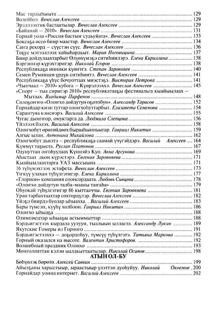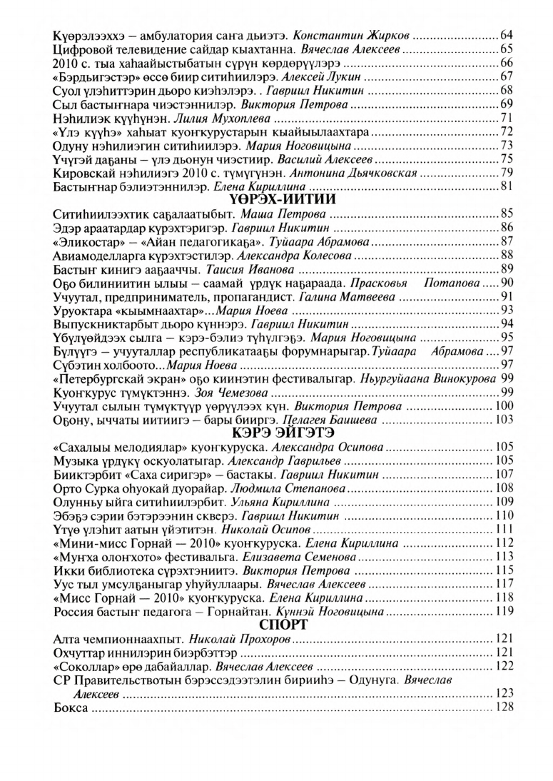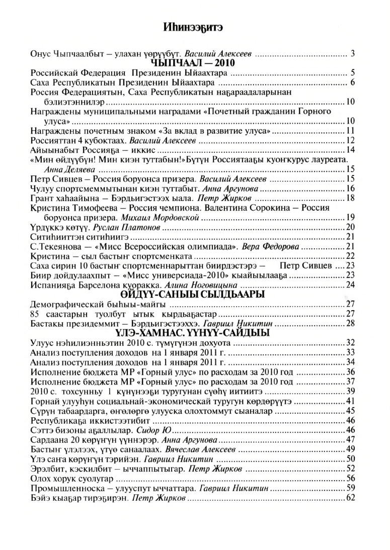 Чыпчаал - 2010. Өйдүү-саныы сылдьаары / "Горнай улууһа" МО дьаһалтата, "Үлэ күүһэ" хаһыат ред. ; [кинигэ В. И. Алексеев идеятынан, бэчээккэ бэлэмнээһининэн, ред. таҕыста ; хомуйан оҥордулар: В. И. Алексеев, Е. А. Пономарева]. - Дьокуускай : Медиа-холдинг "Якутия", 2011. - 204, [3] с.