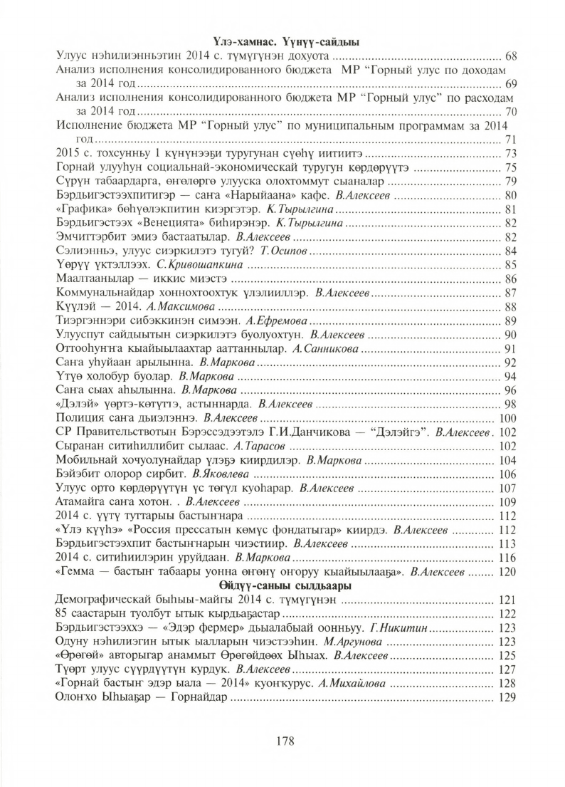 В первой части книги рассказывается об исключительных достижениях, высоких показателях достигнутых в самых различных проявлениях жизни и деятельности трудящихся и молодежи Горного улуса в 2014 году. Далее вносятся итоги развития улуса в 2014 г.