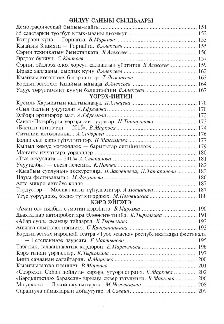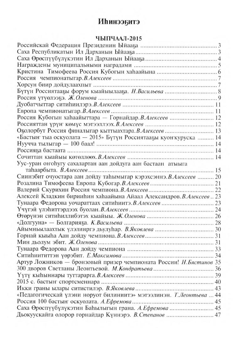 Чыпчаал - 2015. Өйдүү-саныы сылдьаары / "Үлэ күүһэ" хаһыат редакцията ; [кинигэ "Үлэ күүһэ" хаһыат ред. В. И. Алексеев идеятынан, бэчээккэ бэлэмнээһининэн, ред. таҕыста ; хомуйан оҥордулар: В. И. Алексеев, Е. А. Пономарева]. - Бэрдьигэстээх ; Дьокуускай : Медиа-холдинг Якутия, 2016. - 255, [4] с.