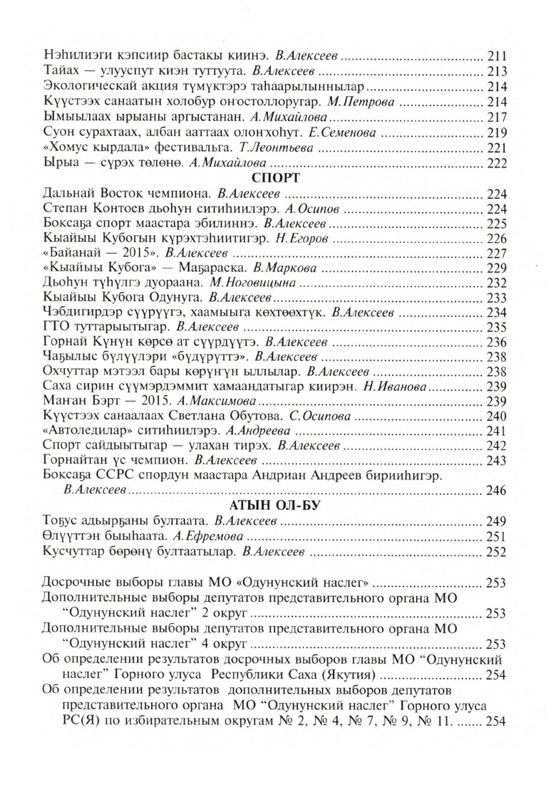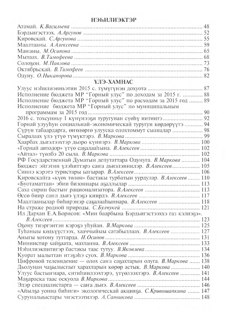 АУ "Редакция газеты Үлэ күүһэ" ("Сила труда"). В первой части книги рассказывается об исключительных достижениях, высоких показателях достигнутых в самых различных проявлениях жизни и деятельности трудящихся и молодежи Горного улуса в 2015 году. Далее вносятся итоги развития улуса в 2015 г.