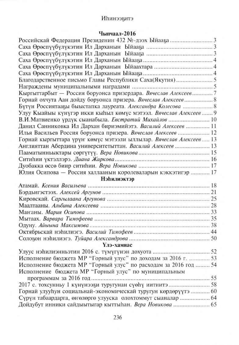 В первой части книги рассказывается об исключительных достижениях, высоких показателях достигнутых в самых различных проявлениях жизни и деятельности трудящихся и молодежи Горного улуса в 2016 году. Далее вносятся итоги развития улуса в 2016 г.