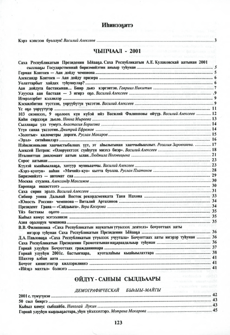 Чыпчаал - 2001. Өйдүү-саныы сылдьаары / Горнай улууһун дьаһалтата[ ; "Үлэ күүһэ" хаһыат редакцията ; хомуйан оҥордулар: В. И. Алексеев, Е. А. Пономарева]. - Дьокуускай : НИПК "Сахаполиграфиздат", 2002. - 122 с.