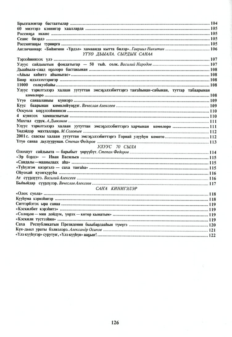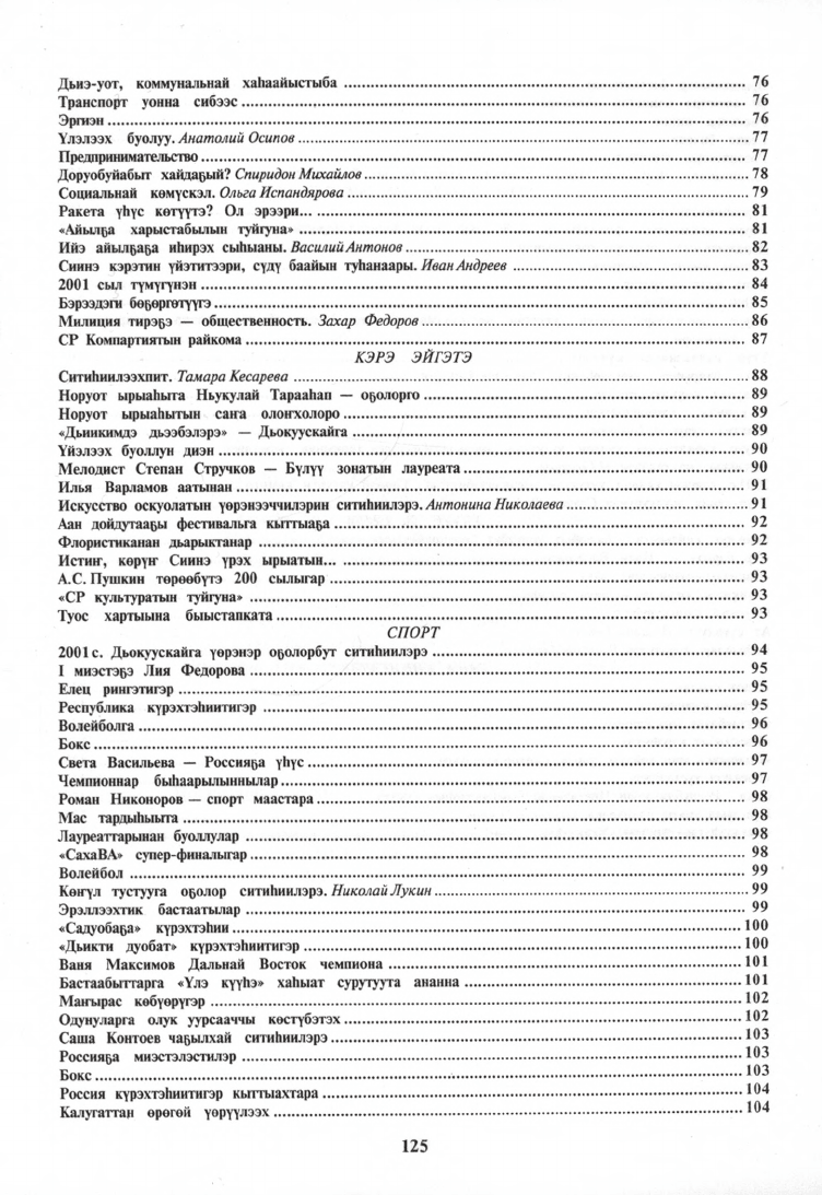 В первой части книги рассказывается об исключительных достижениях, высоких показателях достигнутых в самых различных проявлениях жизни и деятельности трудящихся и молодежи Горного улуса в 2001 году. Далее вносятся итоги развития улуса в первом году ХХI века