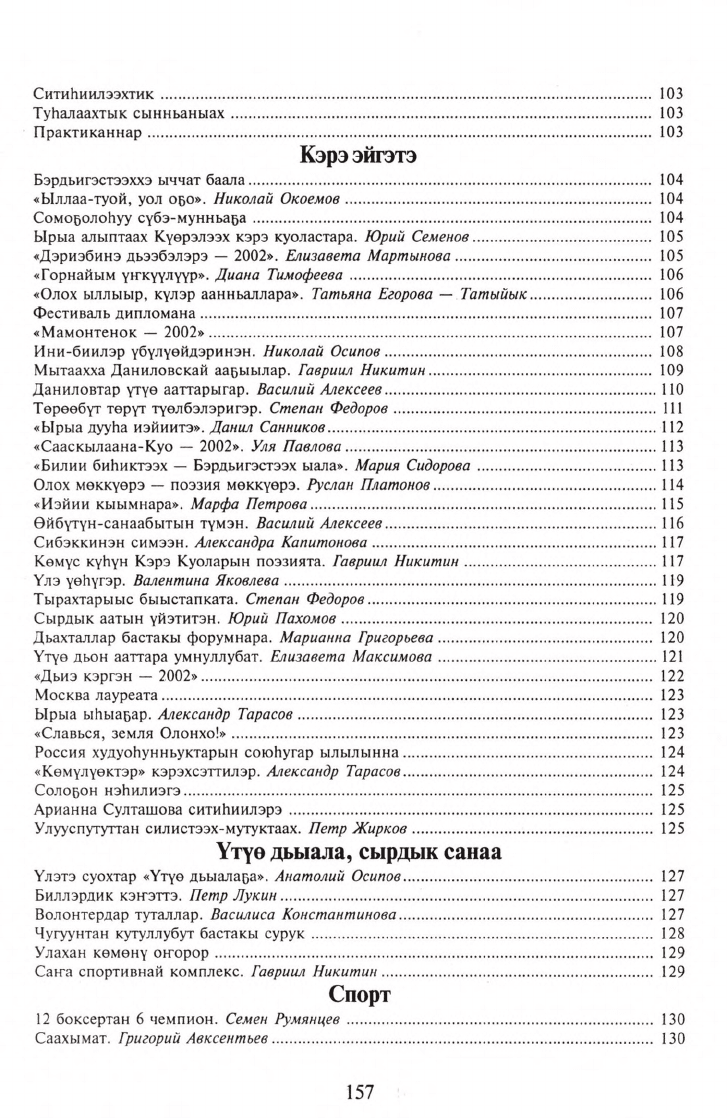 Чыпчаал - 2002 : өйдүү-саныы сылдьаары / Горнай улууһун дьаһалтата, "Үлэ күүһэ" хаһыат ред. ; Хомуйан оҥордулар: В.И. Алексеев, Е.А. Пономарева. - Дьокуускай, 2003. - 158 с.