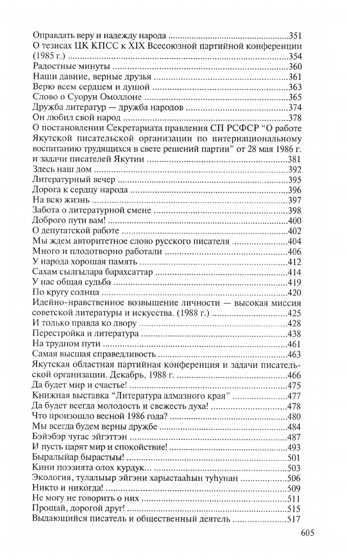 Бу томҥа народнай суруйааччы саха литературатын, саха суруйааччыларын, республика дьонун-сэргэтин үлэтин-хамнаһын тустарынан эппит этиилэрэ, оҥорбут дакылааттара, интервьюлара түмүлүннүлэр