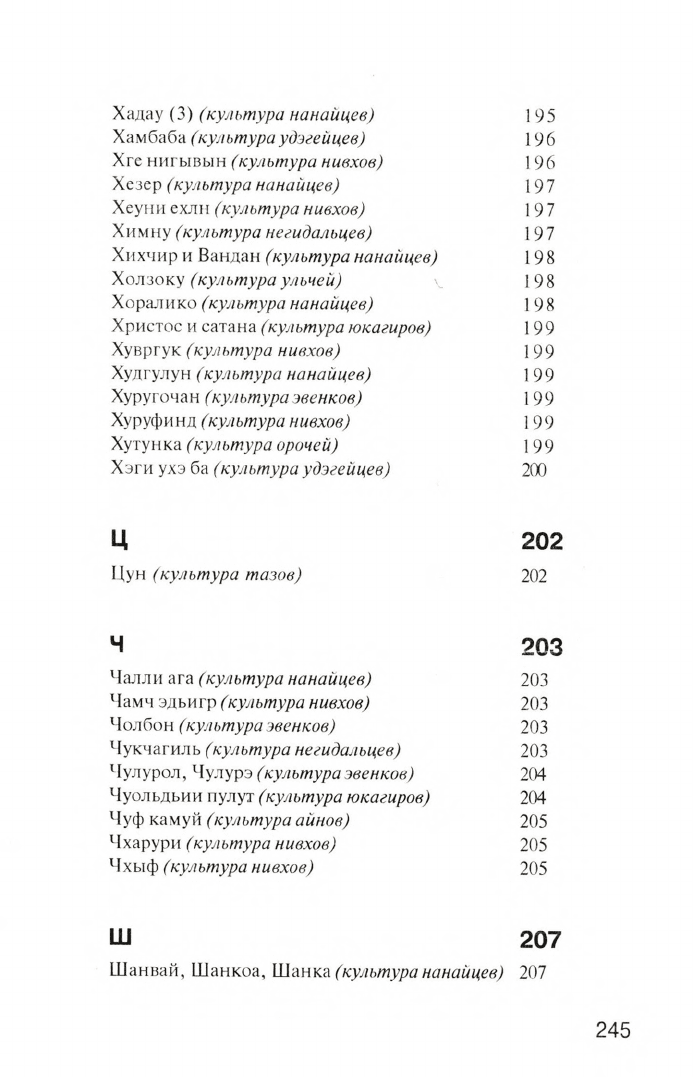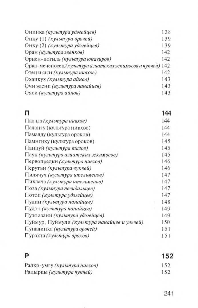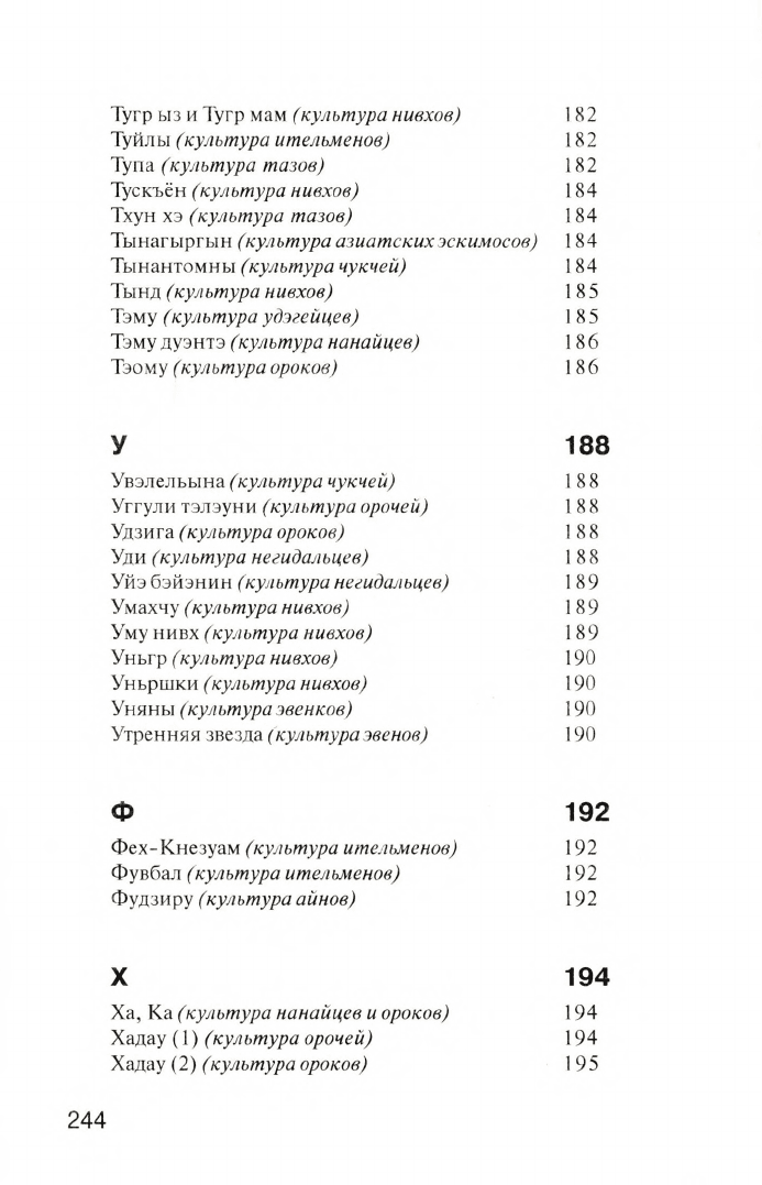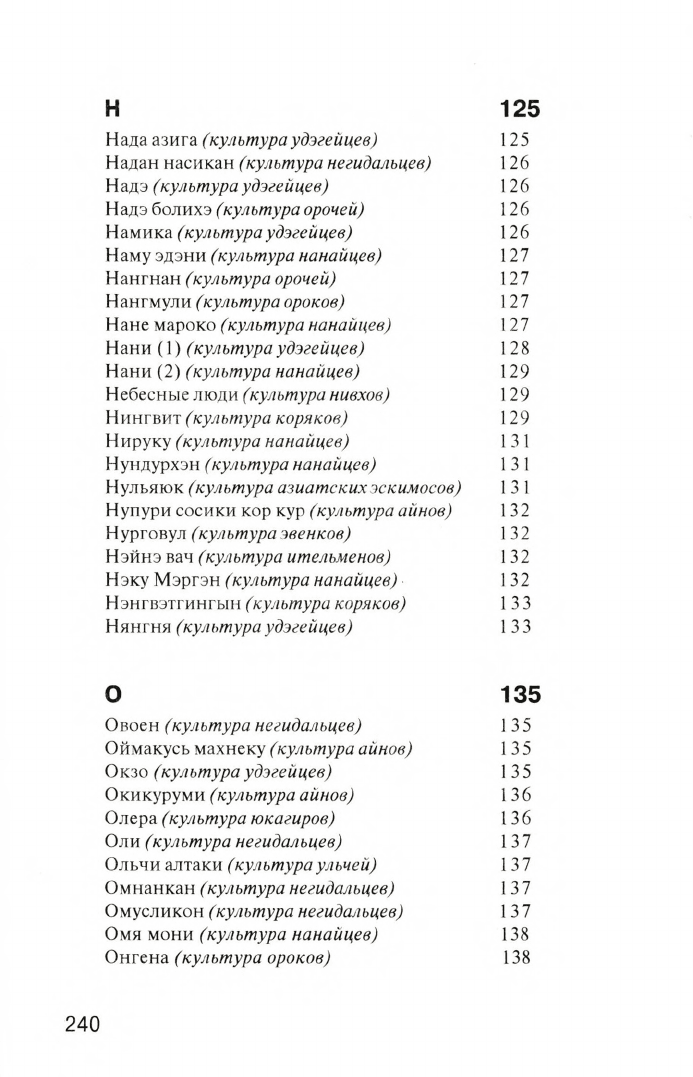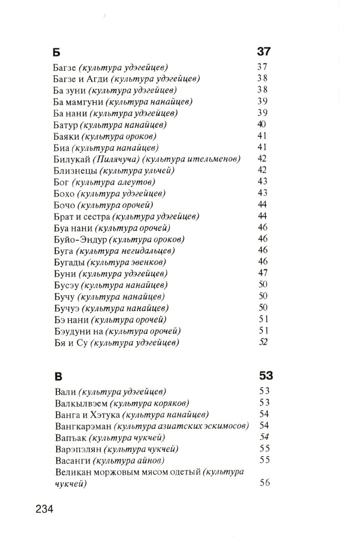 Книга представляет собой первое собрание мифов тунгусо-маньчжуров (эвенков, эвенов, удэгейцев, орочей, нанайцев, негидальцев, ульчей, ороков), палеоазиатов (азиатских эскимосов, алеутов, чукчей, коряков, юкагиров, ительменов, нивхов), сахалинских айнов и тазов. В словаре даются статьи, характеризующие наследие бесписьменных культур, приводятся наиболее важные этнографические и религиозно-мифологические понятия