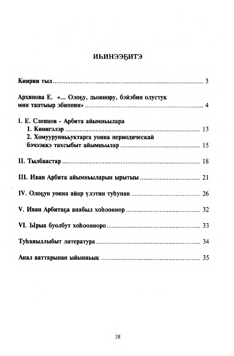 Ааттаах поэт Арбита... И. Е. Слепцов-Арбита : биобиблиографическай ыйынньык / Мэҥэ-Хаҥалас улууһун киин библиотеката, Табаҕа бөһүөлэгин библиотеката ; [ыйынньыгы оҥордулар: К. Н. Попов, Е. Н. Борисова ; редактор Е. А. Архипов]. - Дьокуускай : aМэҥэ-Хаҥалас улууһун библиотеката, 2004. - 38 с.