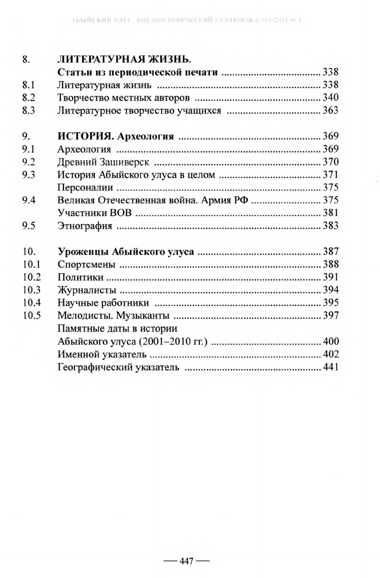 Настоящий указатель включает 5027 библиографических записей на русском и якутском языках. Содержание документов раскрывают все стороны жизни улуса: природные ресурсы, экономику, культуру, историю Абыского улуса с 2001-2010 гг.