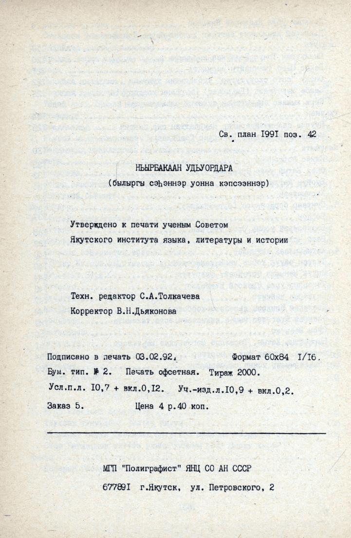 Ньырбакаан удьуордара : (былыргы сэһэннэр уонна кэпсээннэр) / ССРС наукаларын академията, Сиб. отд-ниетын, Саха тылын, лит., историятын ин-та ; [матырыйааллары хомуйда Н. Т. Степанов ; хомуйан оҥордулар: филол. н. к. В. В. Илларионов, Л. Ф. Рожина ; отв. ред. филол. н. д. В. Т. Петров]. - Якутскай : ССРС НА СО ССНК, 1991. - 181 с.