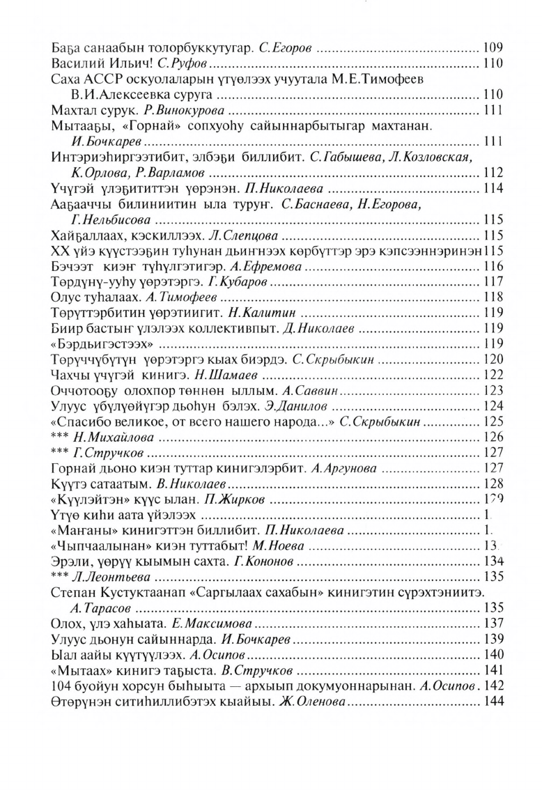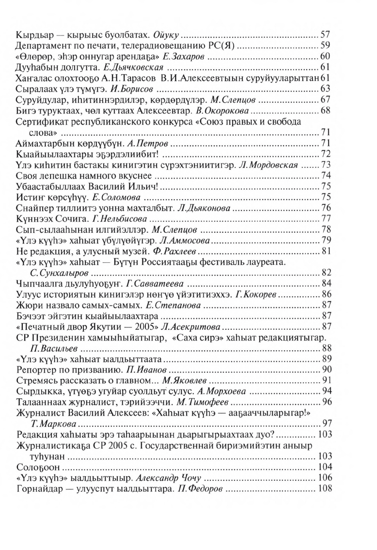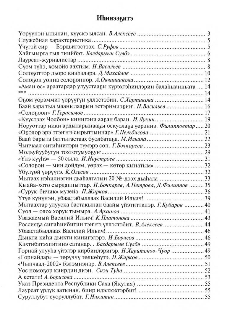 В книгу вошли написанные в разные года статьи главного редактора газеты "Үлэ күүһэ" Горного улуса В. И. Алексеева, а также статьи коллег, друзей, родственников посвященных В. И. Алексееву