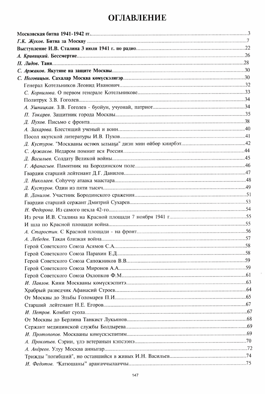 В сборник вошли статьи, сведения о якутянах, участниках защиты Москвы в 1941-1942 гг., а также воспоминания самих ветеранов, их родственников и знакомых