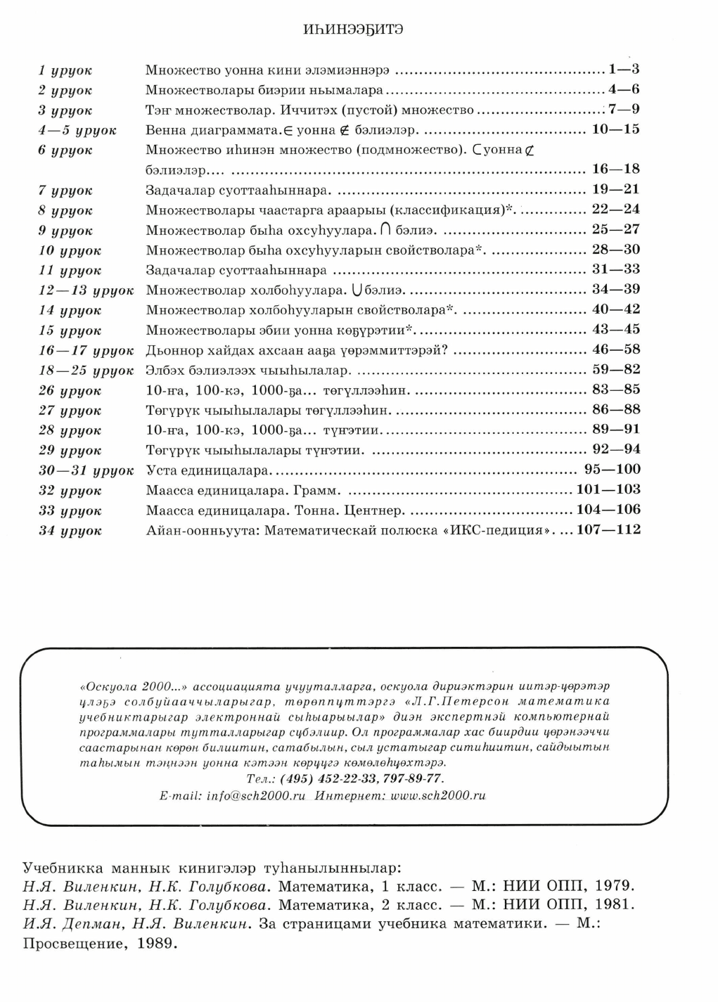 Петерсон, Л. Г. Математика : 3 кылаас : 1-4 программа : [3 чаастаах] / Л. Г. Петерсон ; нууччалыыттан сахалыы тылбаас: М. Е. Винокурова. – Дьокуускай : Бичик, 2007. – 1 чааһа. – 113 с. : ил. – ISBN 978-5-7696-2675-3.