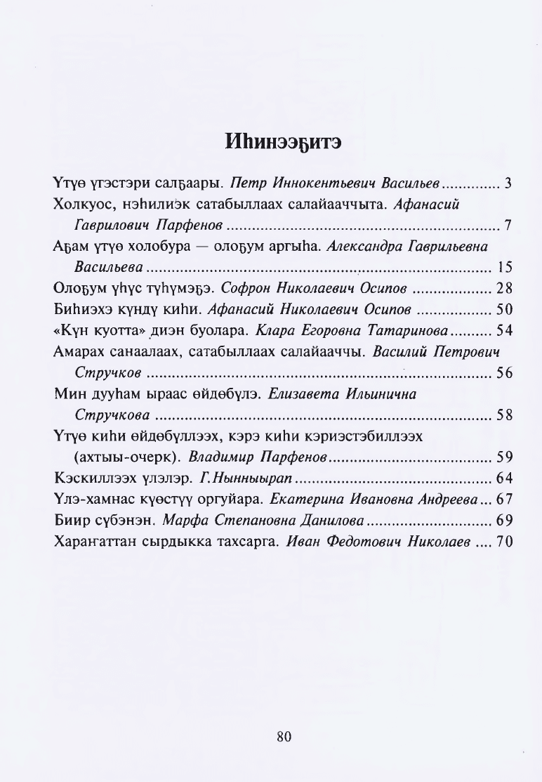В книге собраны воспоминания о видном представителе колхозного движения в Мытахском наслеге Г. Е. Парфенова