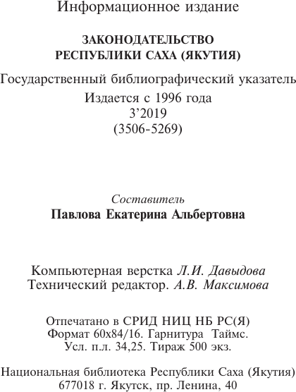 Законодательство Республики Саха (Якутия) [Электронный ресурс] : государственный библиографический указатель = Саха Өрөспүүбүлүкэтин Сокуонтаһаарыы : судаарыстыбаннай библиографическай ыйынньык / М- во культуры и духовного развития Респ. Саха (Якутия), Нац. б-ка Респ. Саха (Якутия), Нац. библиогр. агентство. - Электрон. дан. - Якутск : СРИД НБ РС(Я), 2018-.2019, N 3 (3506-5269). - Электрон. дан. (1 файл: 6,32 Мб). - 2019.