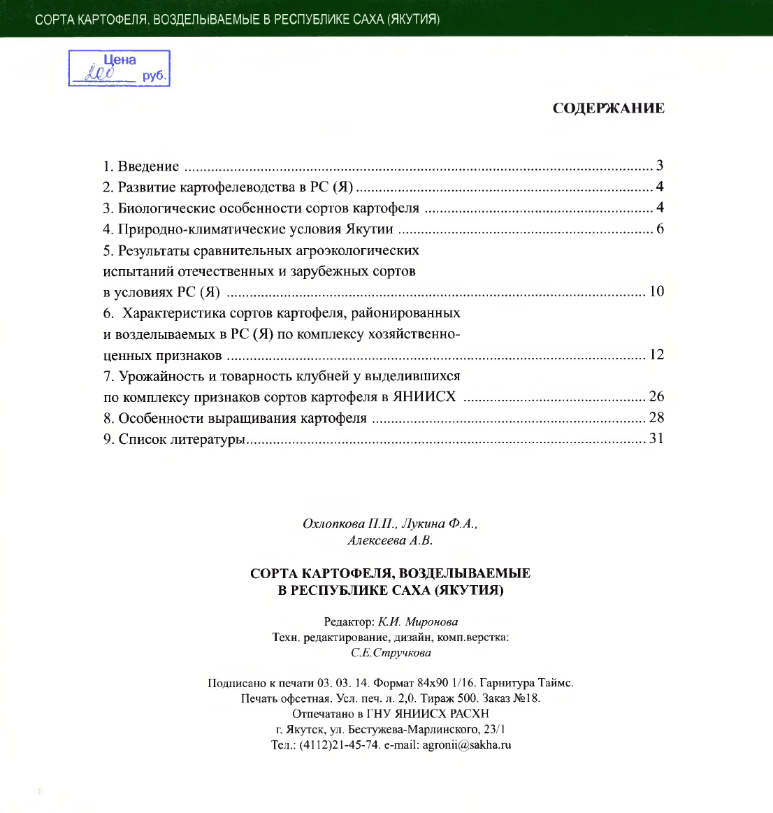 Сорта картофеля, возделываемые в Республике Саха (Якутия) / Гос. науч. учреждение, Якут. науч.-исслед. ин-т сел. хоз-ва ; [сост.: П. П. Охлопкова, д-р с.-х.н., Ф. А. Лукина, к.с.-х.н., А. В. Алексеева ; под ред. д.с.-х.н. П. П. Охлопкова] . - Якутск : ГНУ ЯНИИСХ РАСХН, 2014. - 30, [2] с.