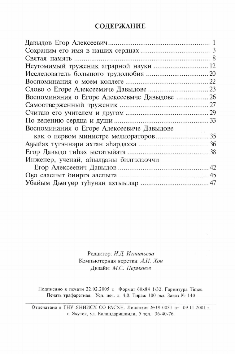 Давыдов Егор Алексеевич : (воспоминания о нем) / Рос. акад. с.-х. наук, Сиб. отд-ние, Якут. науч.-исслед. ин-т сел. хоз-ва ; [отв. ред. М. П. Неустроев, д. вет. н.]. - Якутск : ЯНИИСХ СО РАСХН, 2005. - 63, [1] с.
