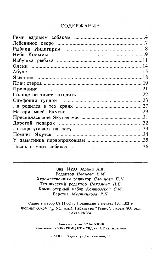 В сборнике стихов известного якутского поэта С. Е. Дадаскинова воспевается красота и простор северного края, обычаи и традиции охотников и оленеводов Заполярья РС (Я)