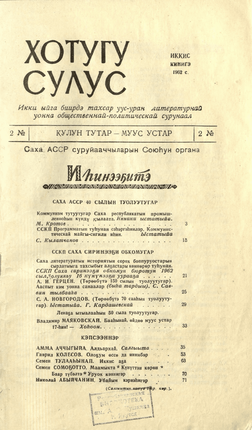 - 1. Хотугу сулус: [сахалыы тылынан уус-уран литературнай. уонна общественно-политическай сурунаал], 1962, №1