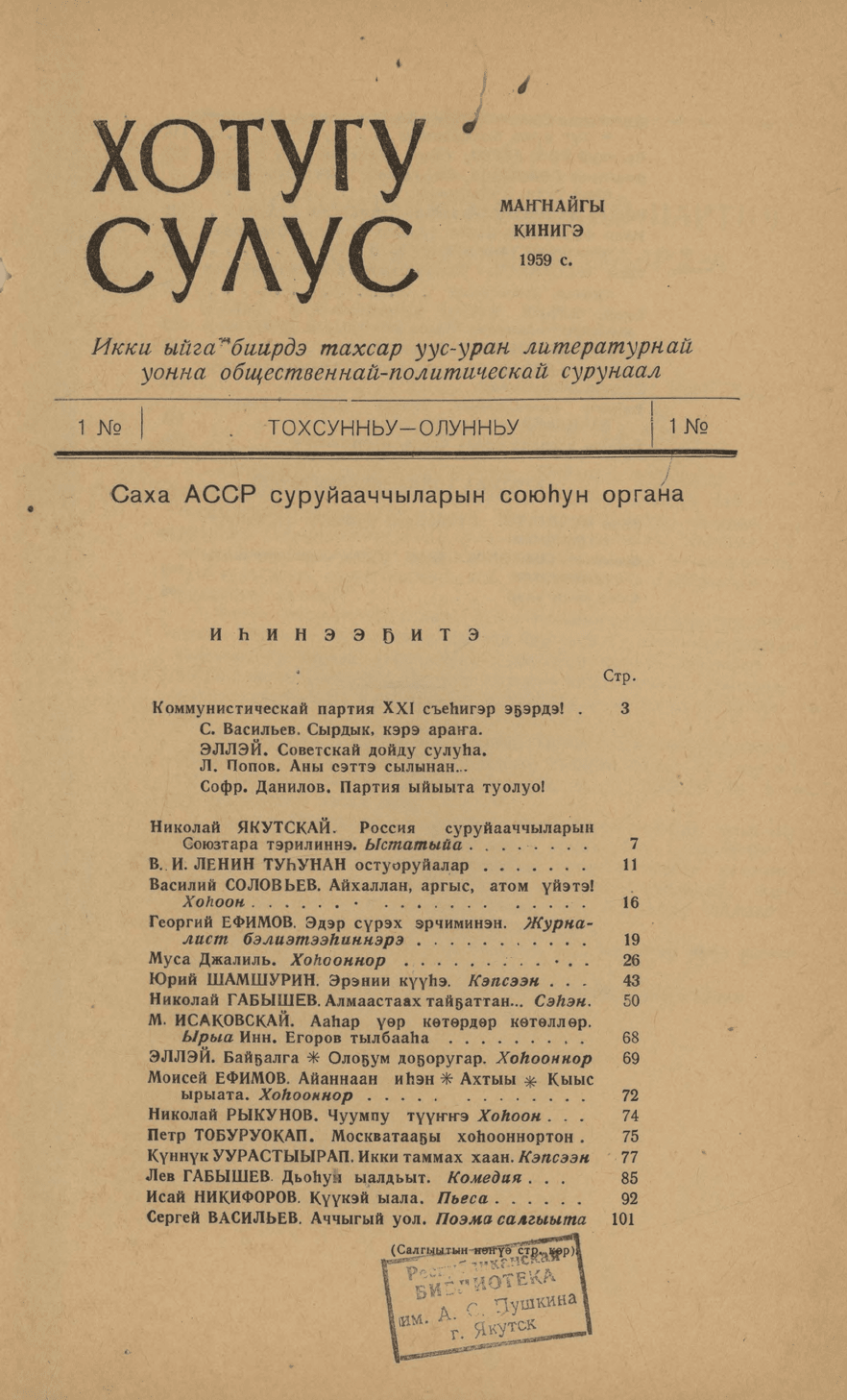 Хотугу сулус : [сахалыы тылынан уус-уран литературнай. уонна общественно-политическай сурунаал] / САССР сов. суруйааччыларын союһа. - Якутскай : Саха сиринээҕи кинигэ изд-вота, 1940-1989. 1959, N 1, тохсунньу-олунньу. - 1959. - 144, [2] с.