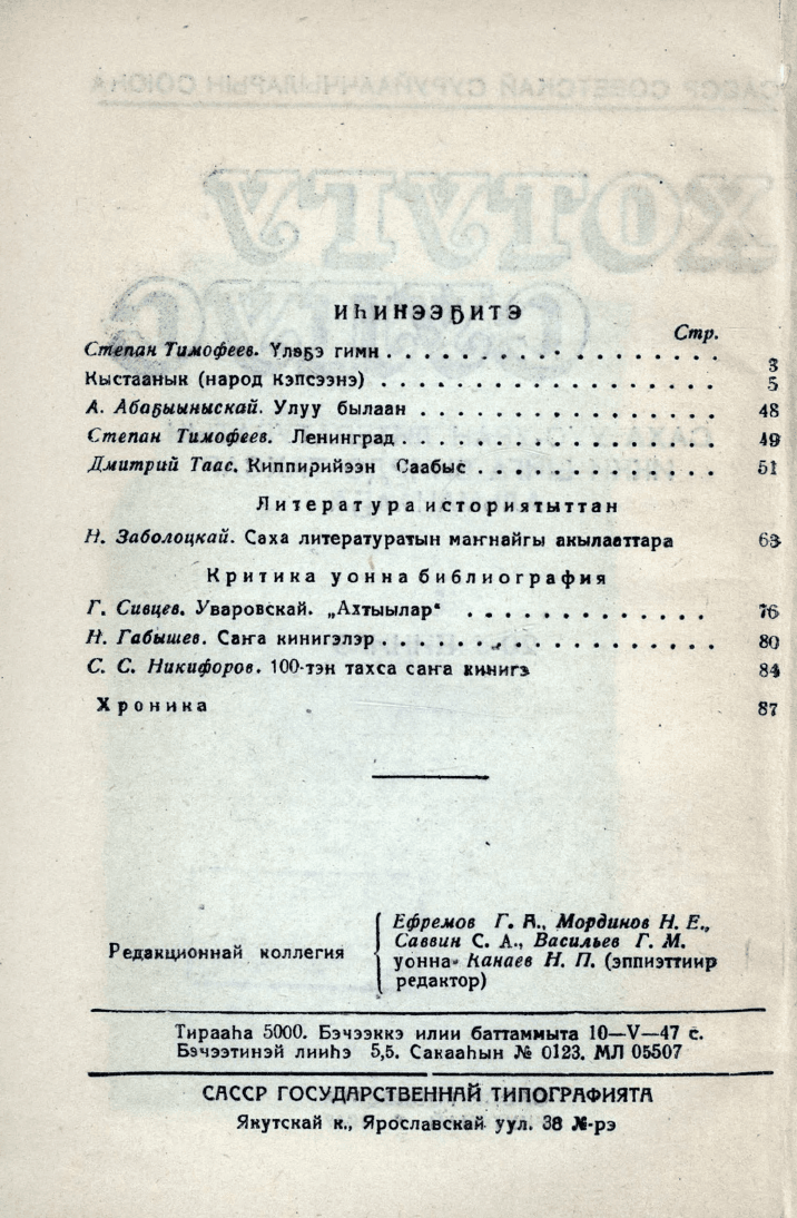 Хотугу сулус : [сахалыы тылынан уус-уран литературнай. уонна общественно-политическай сурунаал] / САССР сов. суруйааччыларын союһа. - Якутскай : Саха сиринээҕи кинигэ изд-вота, 1940-1989. 1947, N 2 (20). - 1947. - 87, [1] с.