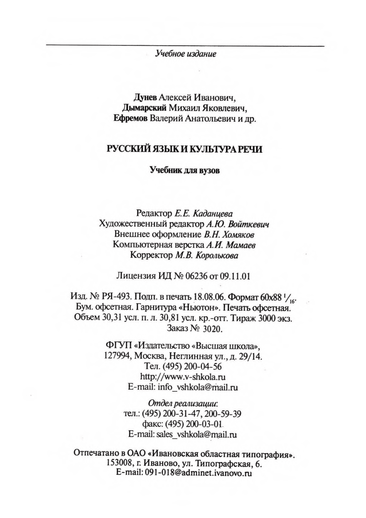 Русский язык и культура речи : учебник для вузов / [к.филол.н. А. И. Дунев, д.филол.н. М.Я. Дымарский, к.филол.н. ВА. Ефремов и др.] ; под ред. д.филол.н., проф. В. Д. Черняк. - Изд. 2-е, испр. и доп. - Москва : Высш. шк., 2006. - 493, [2] с.