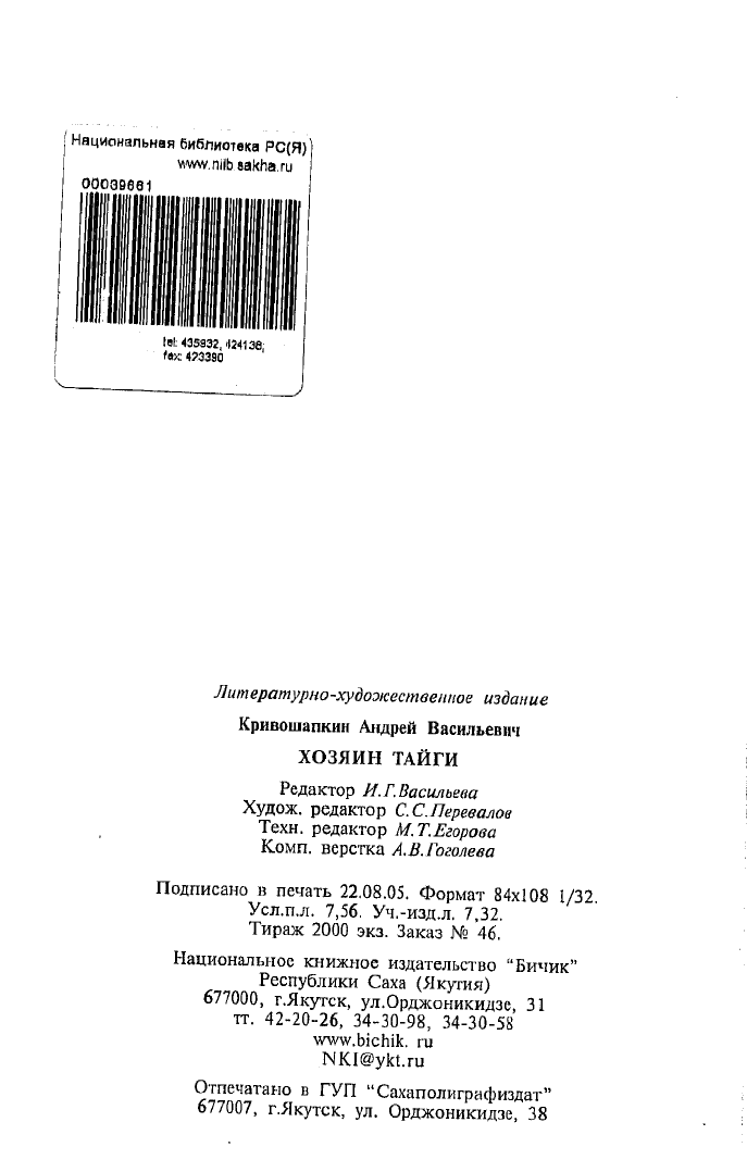 Хара тыа хаһаайына : [тэттик кэпсээннэртэн сэһэн] / Андрей Кривошапкин ; [киирии тылы суруйда, тылбаастаата Д. В. Кириллин]. - Дьокуускай : Бичик, 2005. - 141, [2] с.