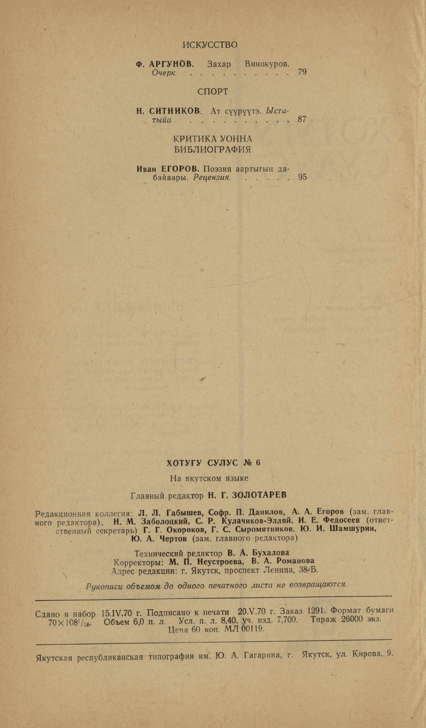 Хотугу сулус : [сахалыы тылынан уус-уран литературнай уонна общественно-политическай сурунаал] / САССР советскай суруйааччыларын союһа. - Якутскай : Саха сиринээҕи кинигэ издательствота, 1940-1989. 1970, N 6. - 1970. - 96 с.