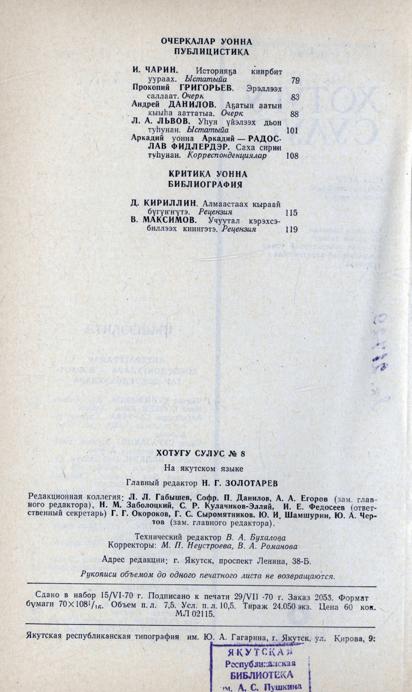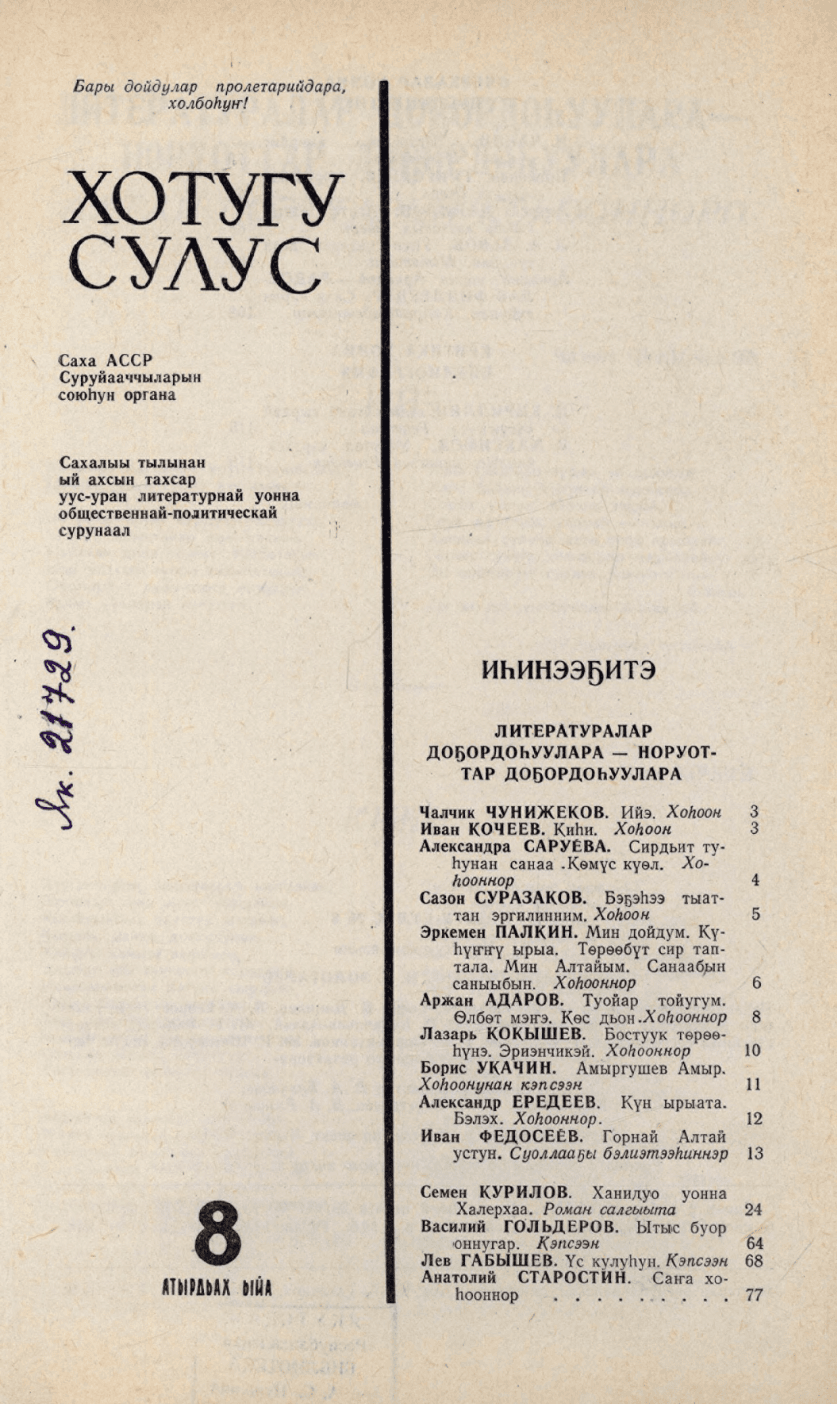 Хотугу сулус : [сахалыы тылынан уус-уран литературнай уонна общественно-политическай сурунаал] / САССР советскай суруйааччыларын союһа. - Якутскай : Саха сиринээҕи кинигэ издательствота, 1940-1989. 1970, N 8. - 1970. - 120 с.