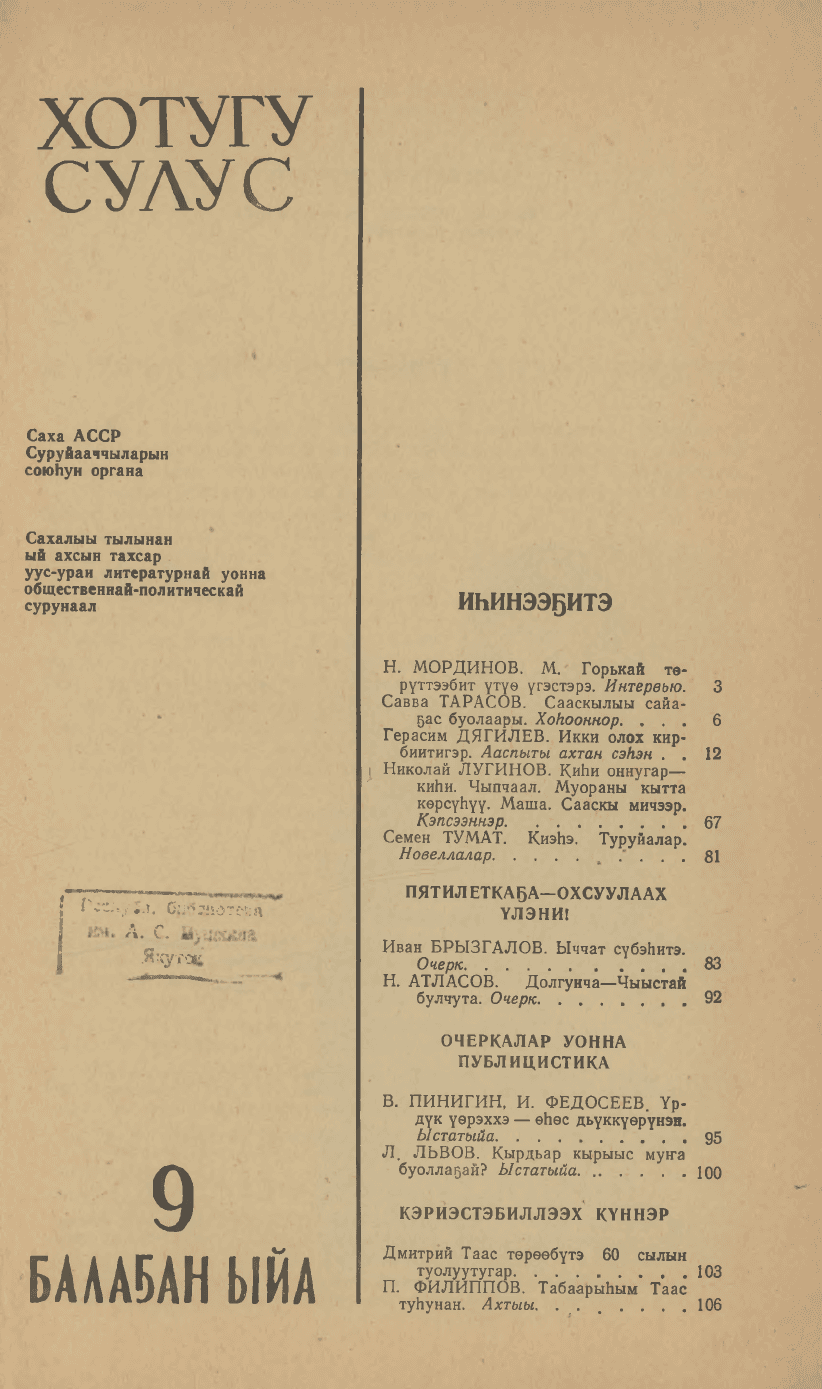 Хотугу сулус : [сахалыы тылынан уус-уран литературнай уонна общественно-политическай сурунаал] / САССР советскай суруйааччыларын союһа. - Якутскай : Саха сиринээҕи кинигэ издательствота, 1940-1989.