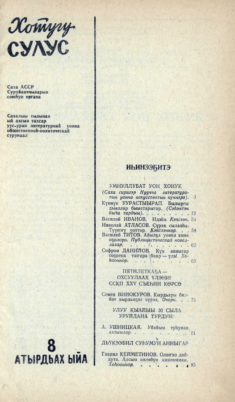 Хотугу сулус : [сахалыы тылынан уус-уран литературнай уонна общественно-политическай сурунаал] / САССР советскай суруйааччыларын союһа. - Якутскай : Саха сиринээҕи кинигэ издательствота, 1940-1989.