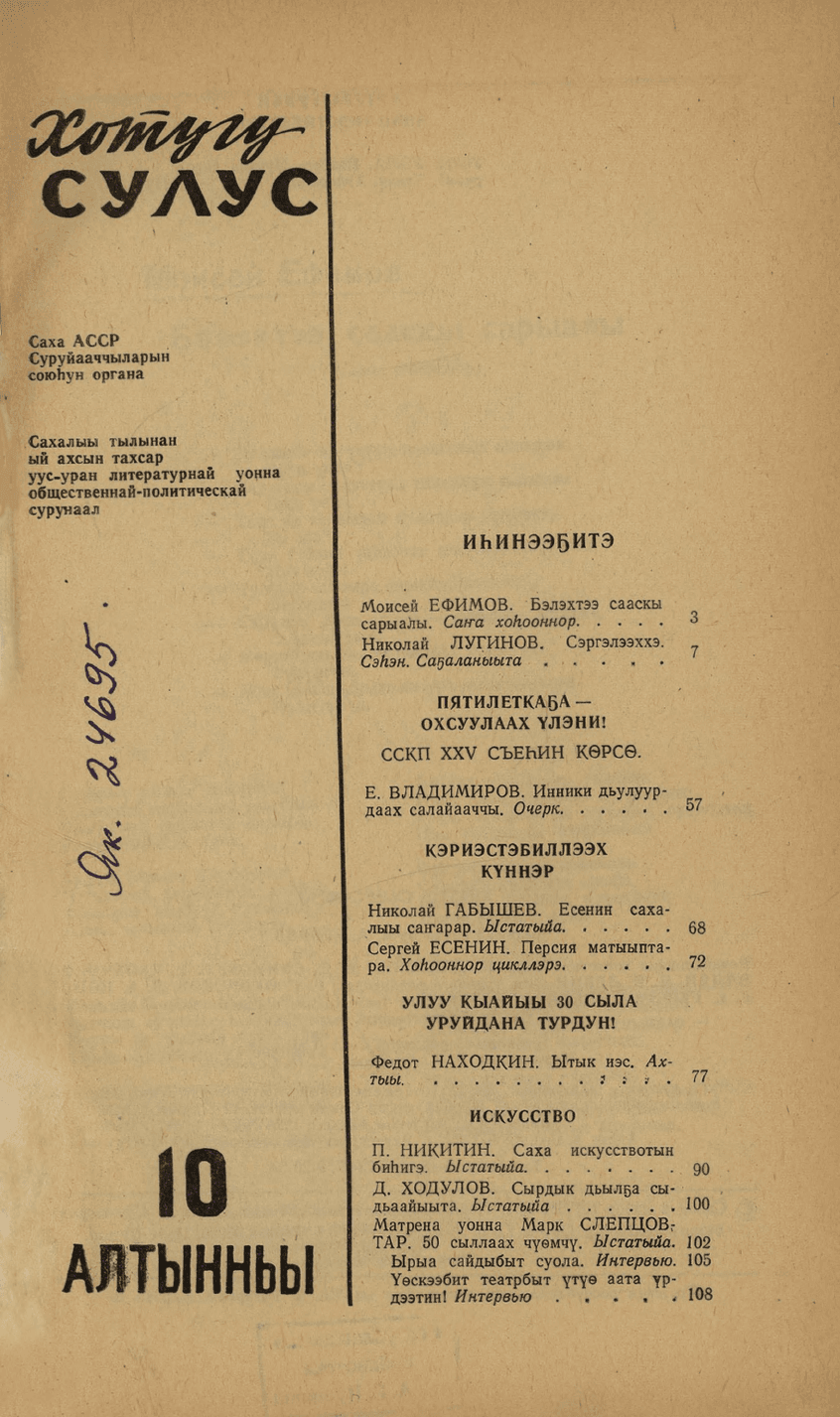 Хотугу сулус : [сахалыы тылынан уус-уран литературнай уонна общественно-политическай сурунаал] / САССР советскай суруйааччыларын союһа. - Якутскай : Саха сиринээҕи кинигэ издательствота, 1940-1989. 1975, N 10. - 1975. - 120 с.
