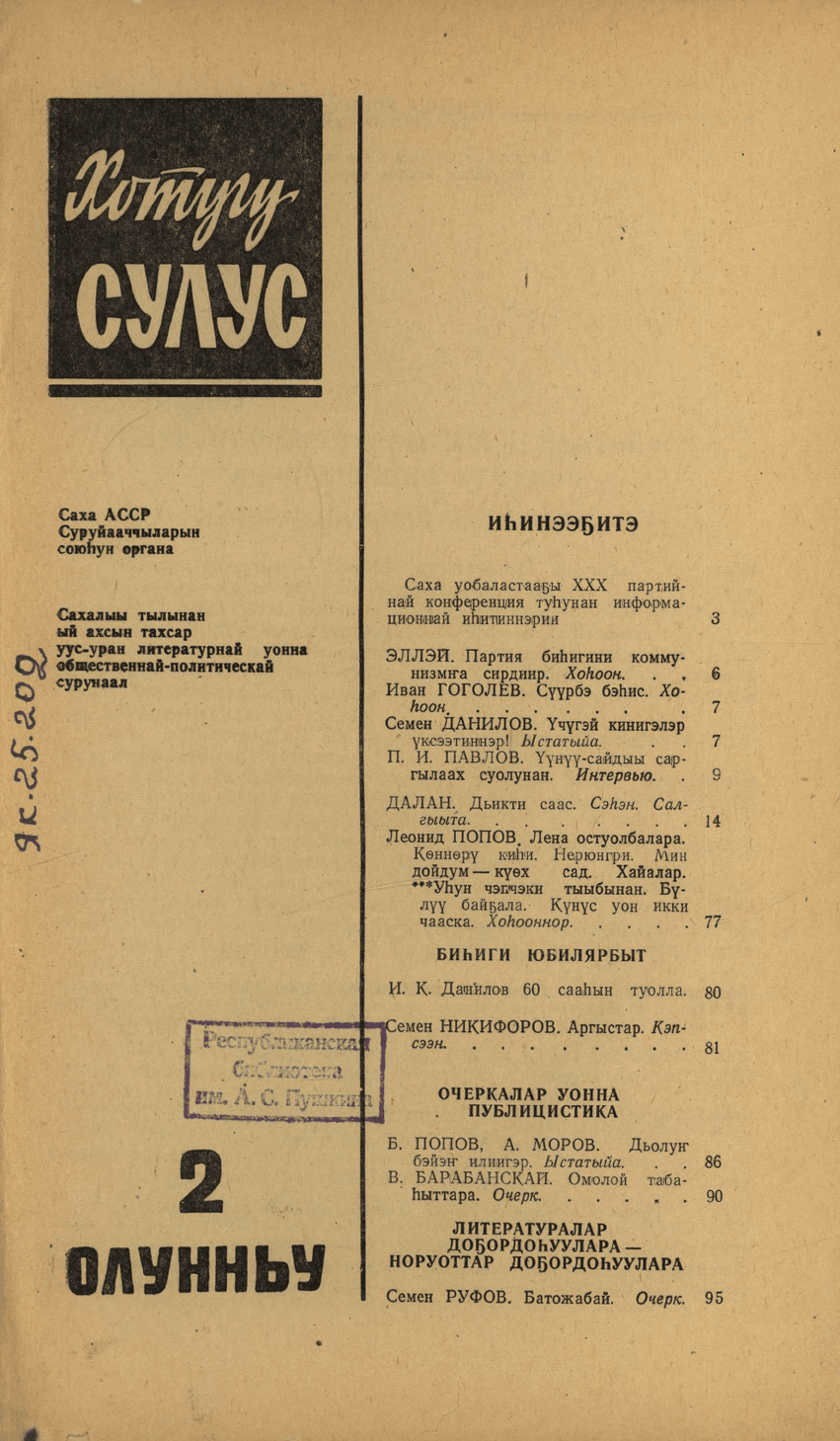 Хотугу сулус : [сахалыы тылынан уус-уран литературнай уонна общественно-политическай сурунаал] / САССР советскай суруйааччыларын союһа. - Якутскай : Саха сиринээҕи кинигэ издательствота, 1940-1989.