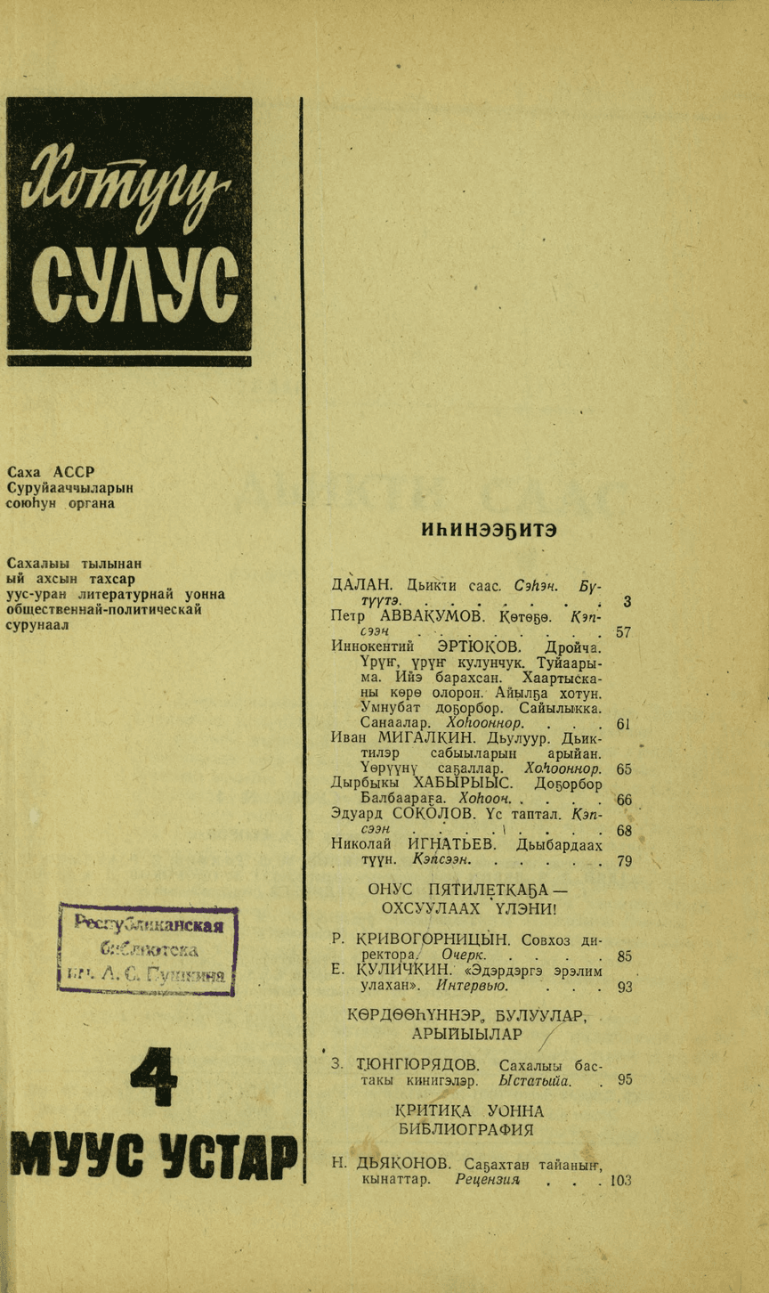 Хотугу сулус : [сахалыы тылынан уус-уран литературнай уонна общественно-политическай сурунаал] / САССР советскай суруйааччыларын союһа. - Якутскай : Саха сиринээҕи кинигэ издательствота, 1940-1989. 1976, N 4. - 1976. - 103, [1] с.