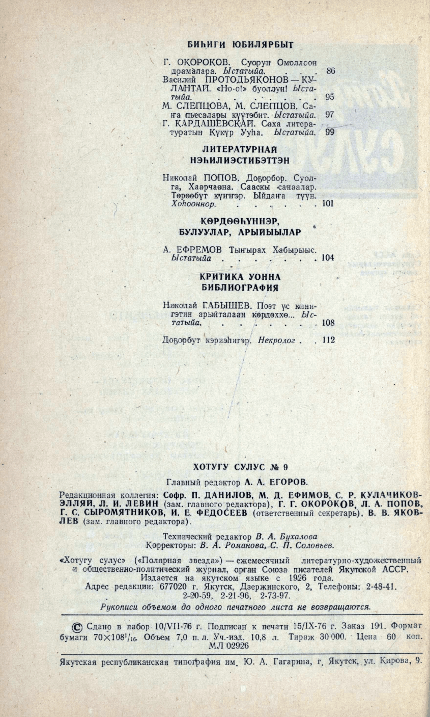 Хотугу сулус : [сахалыы тылынан уус-уран литературнай уонна общественно-политическай сурунаал] / САССР советскай суруйааччыларын союһа. - Якутскай : Саха сиринээҕи кинигэ издательствота, 1940-1989. 1976, N 9. - 1976. - 110, [2] с.