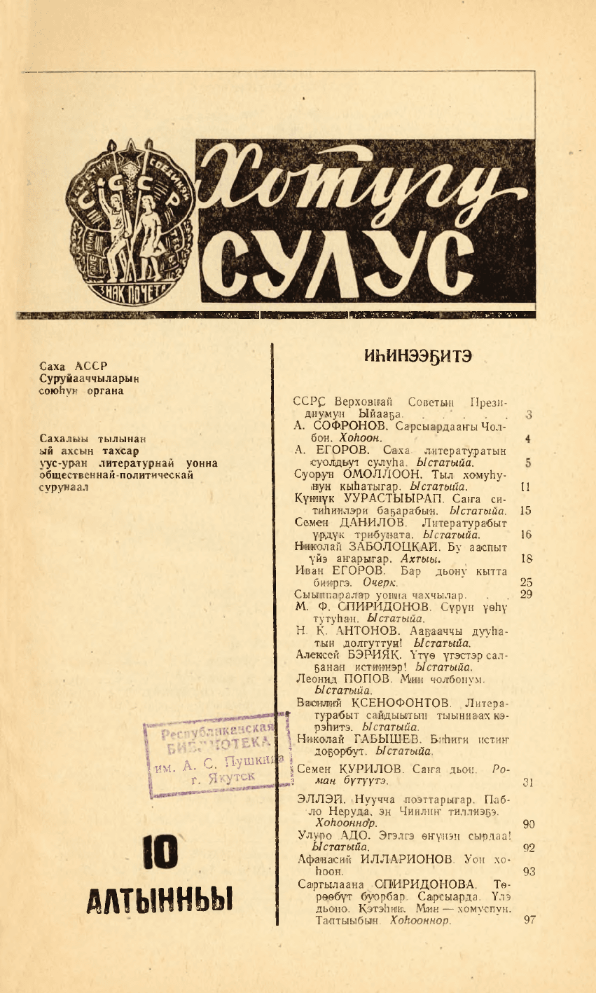 Хотугу сулус : [сахалыы тылынан уус-уран литературнай уонна общественно-политическай сурунаал] / САССР советскай суруйааччыларын союһа. - Якутскай : Саха сиринээҕи кинигэ издательствота, 1940-1989. 1976, N 10. - 1976. - 120 с.