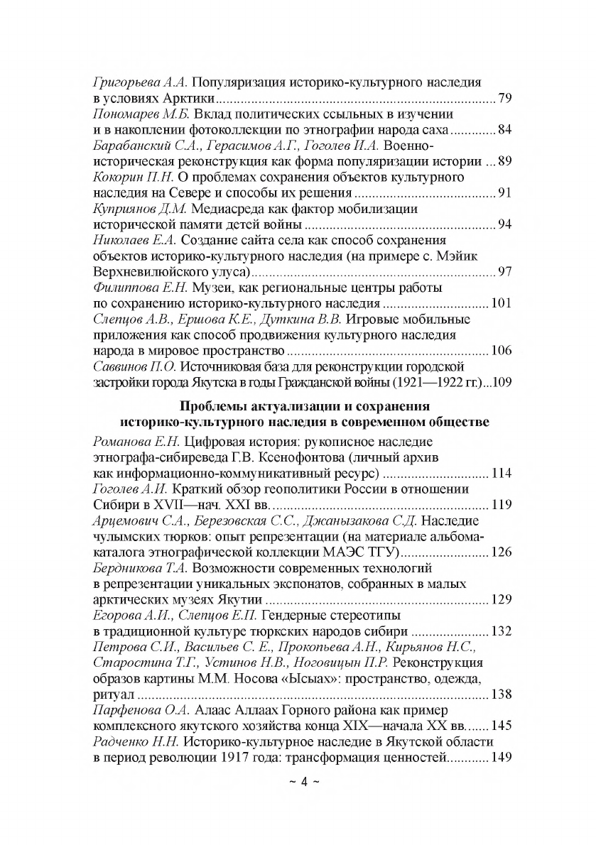 Историко-культурное наследие народов Севера, Сибири и Дальнего Востока Российской Федерации : проблемы репрезентации в формате современных цифровых технологий [Электронный ресурс] : материалы Всероссийской (с международным участием) научно-практической конференции "Историко-культурное наследие народов Севера, Сибири и Дальнего Востока Российской Федерации: проблемы репрезентации в формате современных цифровых технологий" : (г. Якутск, 30 мая — 1 июня 2019 г.) / редакционная коллегия: кандидат исторических наук Н. А. Стручкова, доктор исторических наук Е. Н. Романова, кандидат исторических наук Ю. Н. Ермолаева ; ответственный редактор доктор исторических наук А. И. Гоголев. - Электрон. дан. (1 файл: 9,35 Мб). - Якутск : Электронное издательство НБ РС(Я), 2019. - 231, [1] с.