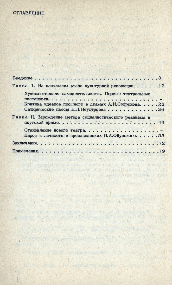 В работе рассматривается развитие якутской драматургии 20-х годов как части всесоюзного культурного процесса. Выявляется влияние на становление драмы литературных и фольклорных традиций, театральных форм. Показаны эволюция реалистических принципов изображения в пьесах данного десятилетия, зарождение метода социалистического реализма