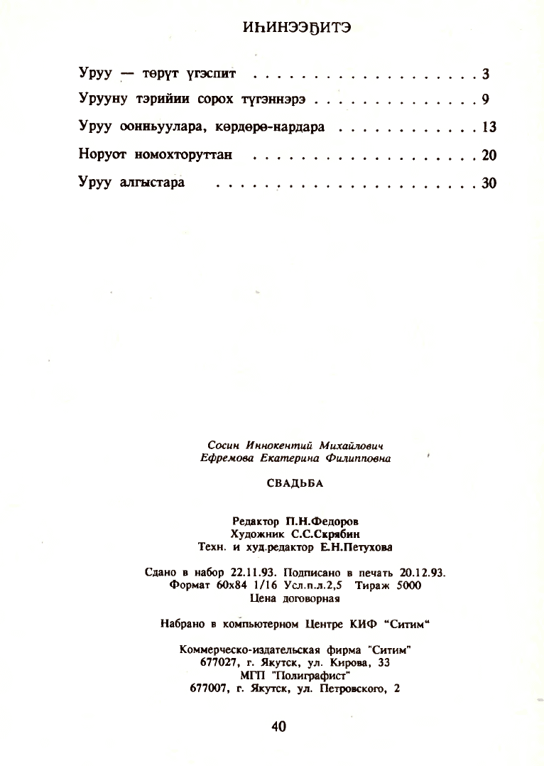 В настоящей книге Сосин И. М., Ефремова Е. Ф. пишут о самом счастливом дне молодых, о проведении и организации якутской свадьбы на основе старинных якутских традиций и обрядов