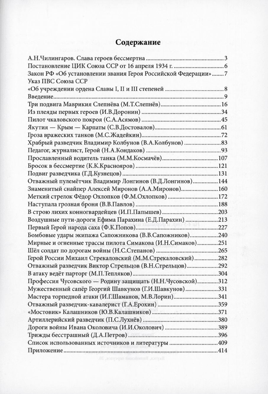 Авторы книги, опираясь на многочисленные документальные источники, мемуары, научные труды и работы предшественников, воссоздали трудовой и боевой путь якутян - 24 Героев Советского Союза и одного Героя Российской Федерации, пятерых полных кавалеров ордена Славы, проявивших беспримерное мужество и отвагу в годы Великой Отечественной войны. В книге помещены также очерки о летчиках И. В. Доронине и М. Т. Слепневе - о первых Героях Советского Союза
