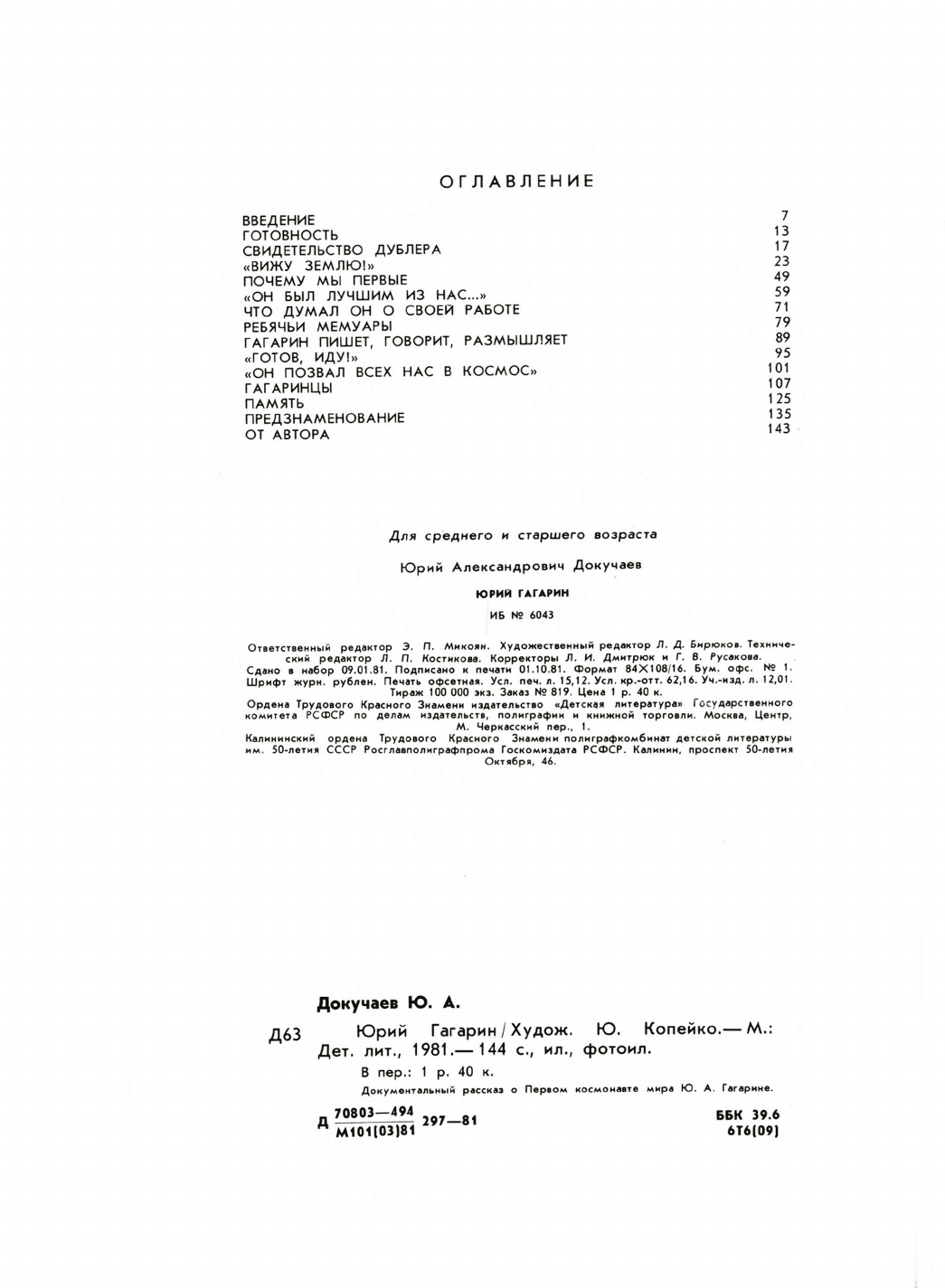 Докучаев, Юрий Александрович. Юрий Гагарин : [для среднего и старшего возраста] / Ю. Докучаев ; худож. Ю. Копейко. - Москва : Детская литература, 1981. - 144 с.