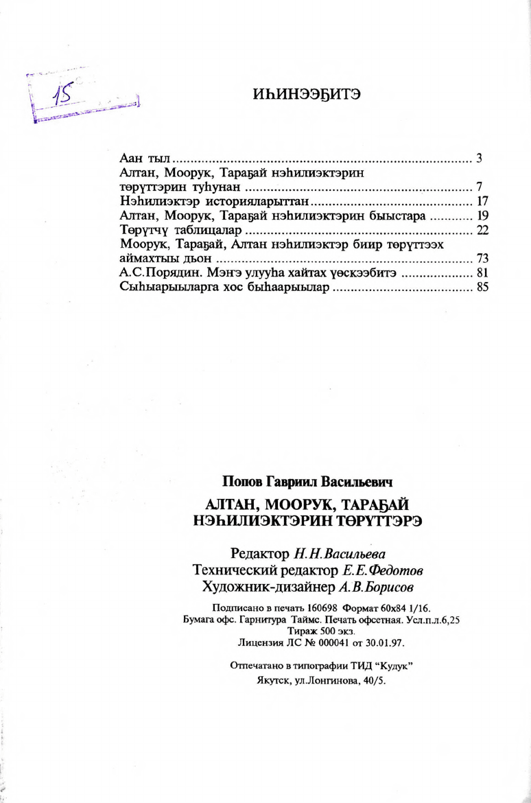 Алтан, Моорук, Тараҕай нэһилиэктэрин төрүттэрэ : Нэһилиэк историятын, биллиилээх, үлэһит дьонун, спортсменнарын туһунан кэпсиир кинигэ / Хомуйан оҥордо Г.В.Попов. - Дьокуускай : Кудук, 1998. - 86 с.