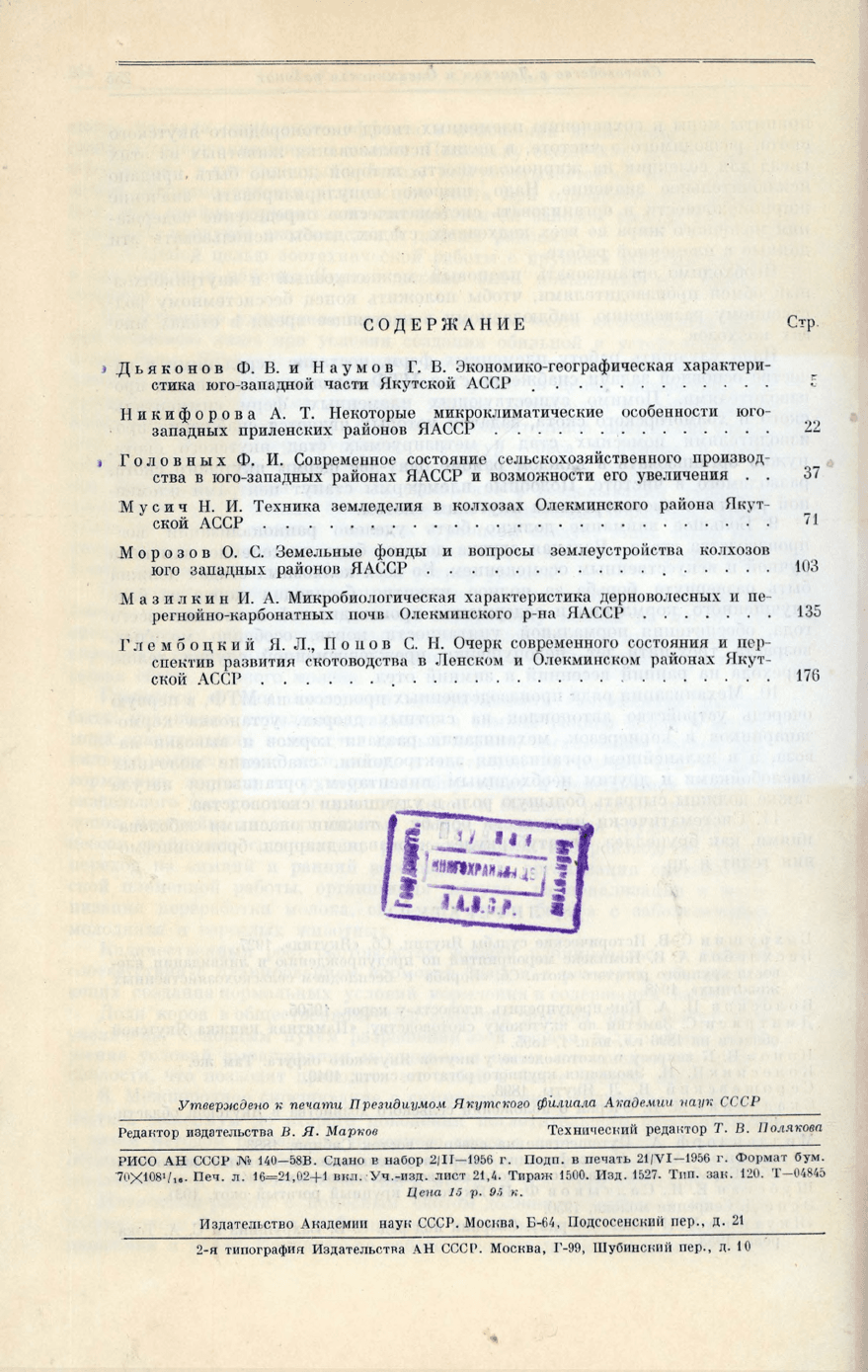 Материалы о природных условиях и сельском хозяйстве юго-запада Якутской АССР / Академия наук СССР, Якутский филиал ; ответственный редактор доктор биологических наук, проф. В. П. Дадыкин. - Москва : Издательство Академии наук СССР, 1956.