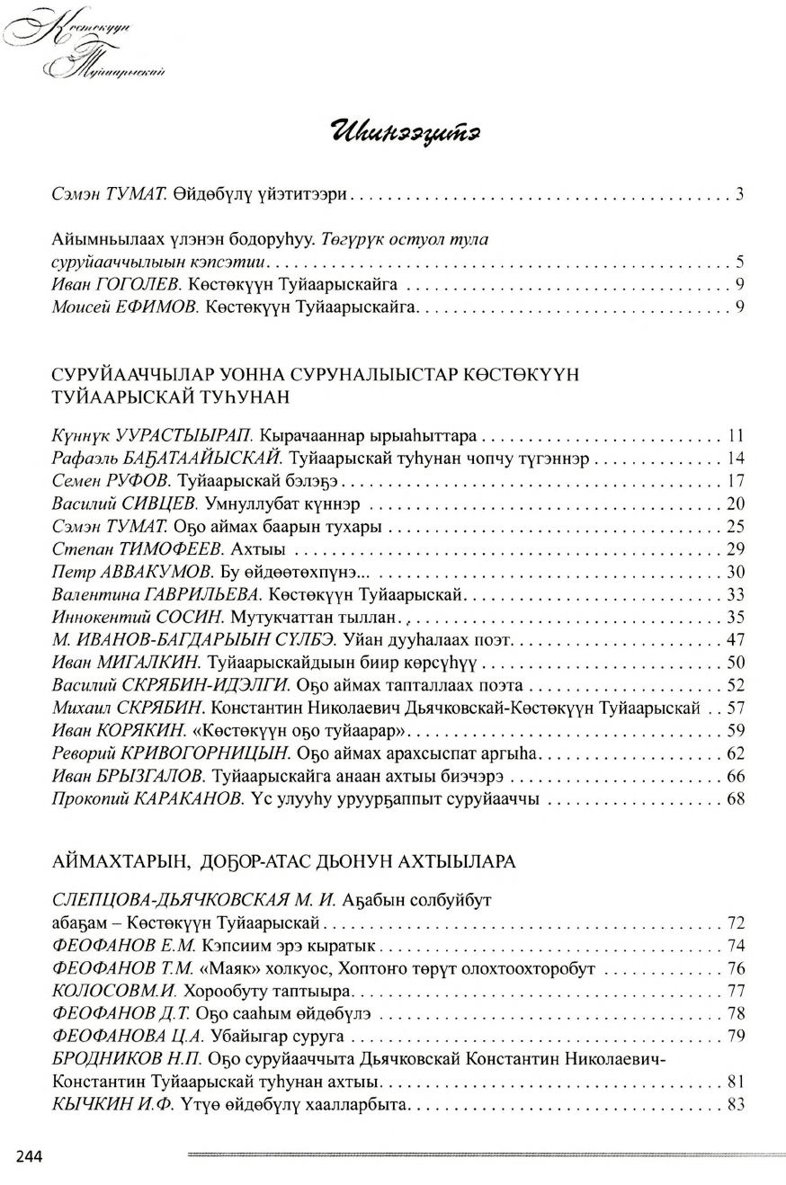 Көстөкүүн Туйаарыскай : ахтыылар, ыстатыйалар, интервьюлар, пьеса, ыйынньык / [хомуйан оҥордулар: Е. В. Попова, Л. И. Кычкина, Г. И. Захарова ; ред. сэбиэт: С. А. Попов-Тумат, Д. Ф. Наумов, С. Е. Макарова ; киирии тылы суруйда С. Тумат]. - Дьокуускай : Көмүөл, 2018. - 246 с.