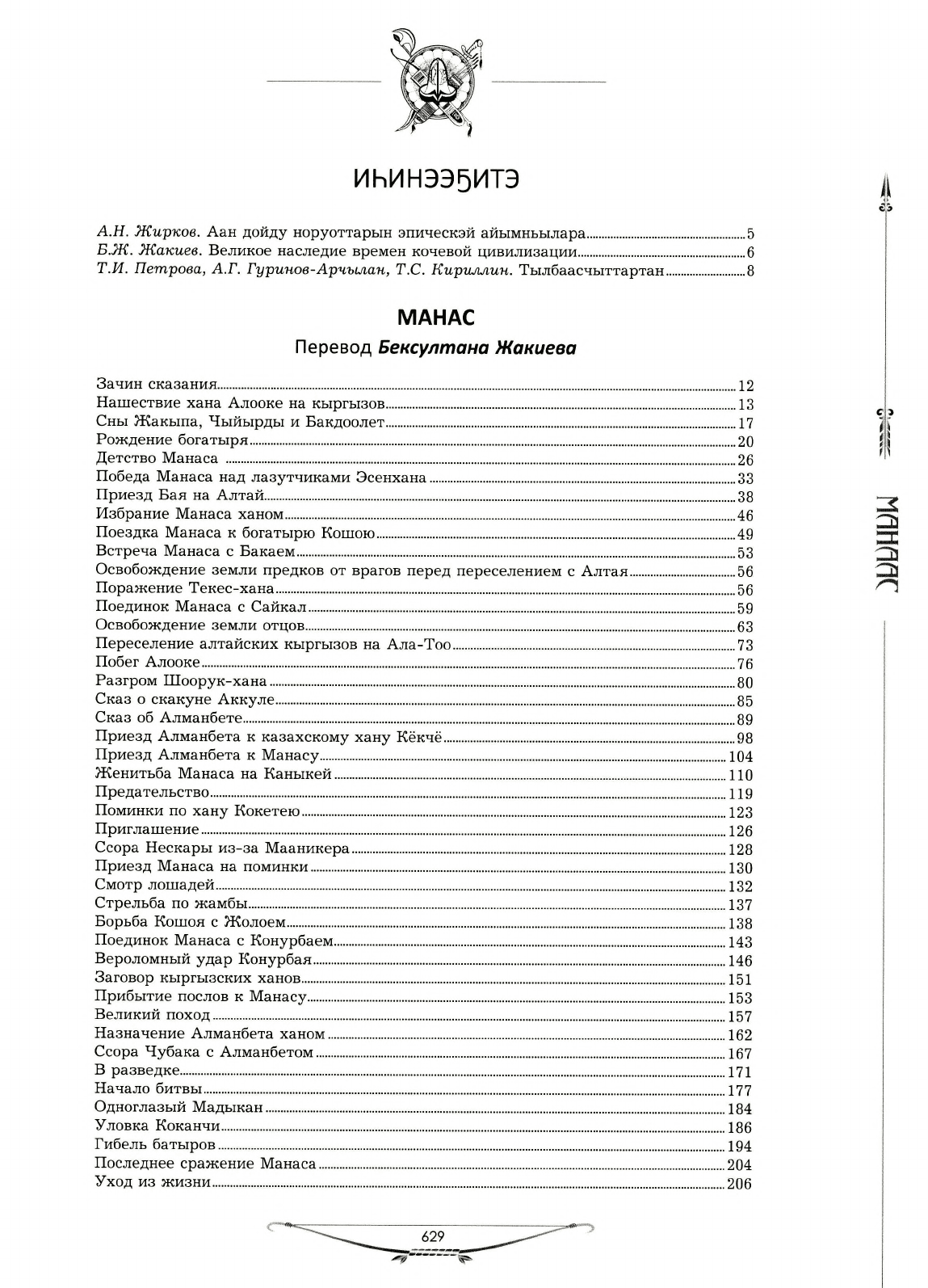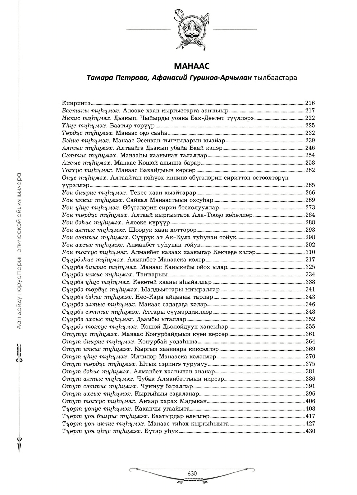Манаас : кыргыз баатырдыы эпоһа / Российскай Федерация ЮНЕСКО дьыалаларыгар комиссията, Кыргызстан Республикатын ЮНЕСКО дьыалаларыгар национальнай комиссията, "Аан дойду норуоттарын эпостара" норуоттар икки ардыларынааҕы ассоциацията "Кыргызстан Республиката" [уо.д.а.] ; Саякбай Каралаев, Сагынбай Орозбаков уо.д.а. манаасчыттар айымньыларыгар олоҕуран Бексултан Жакиев кылгатан суруйуута ; Бексултан Жакиев нууччалыы тылбааһа ; Тамара Петрова, Афанасий Гуринов- Арчылан, Трофим Кириллин нууччалыыттан сахалыы тылбаастара ; Теодор Герцен иллюстрацията ; [хомуйан оҥордо А. Н. Жирков]. - Дьокуускай : Бичик, 2014. - 630, [1] с. : ил. ; 30 см. - (Аан дойду норуоттарын эпическэй айымньылара = Эпические памятники народов мира).