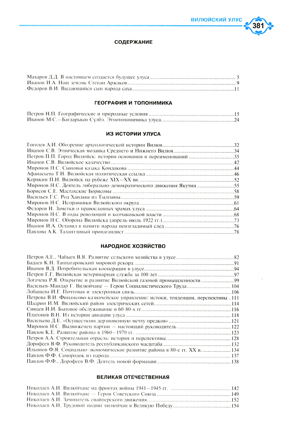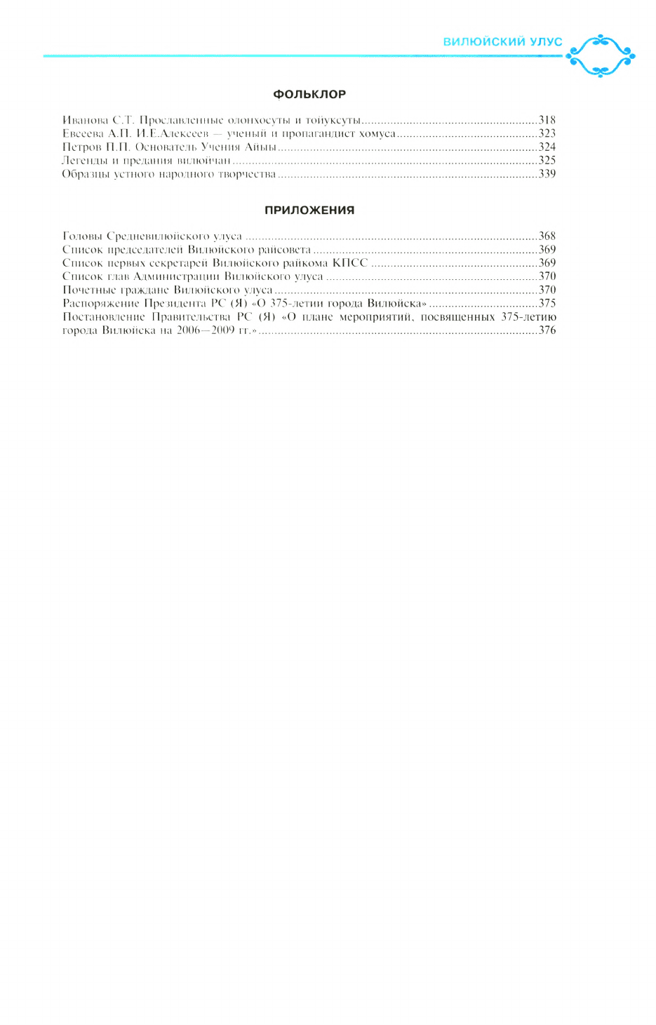 Вилюйский улус : история, культура, фольклор / Администрация муниципального района "Вилюйский улус (район)", Институт гуманитарных исследований и проблем малочисленных народов Севера СО РАН ; [составители: П. П. Петров, Н. С. Миронов ; редактор П. П. Петров]. - Якутск : Бичик, 2009. - 382, [1] с., [16] л. ил., портр. : ил., портр. ; 27 см. - (Улусы Республики Саха (Якутия) / [гл. редкол. серии: А. К. Акимов (гл. ред.) и др.]).